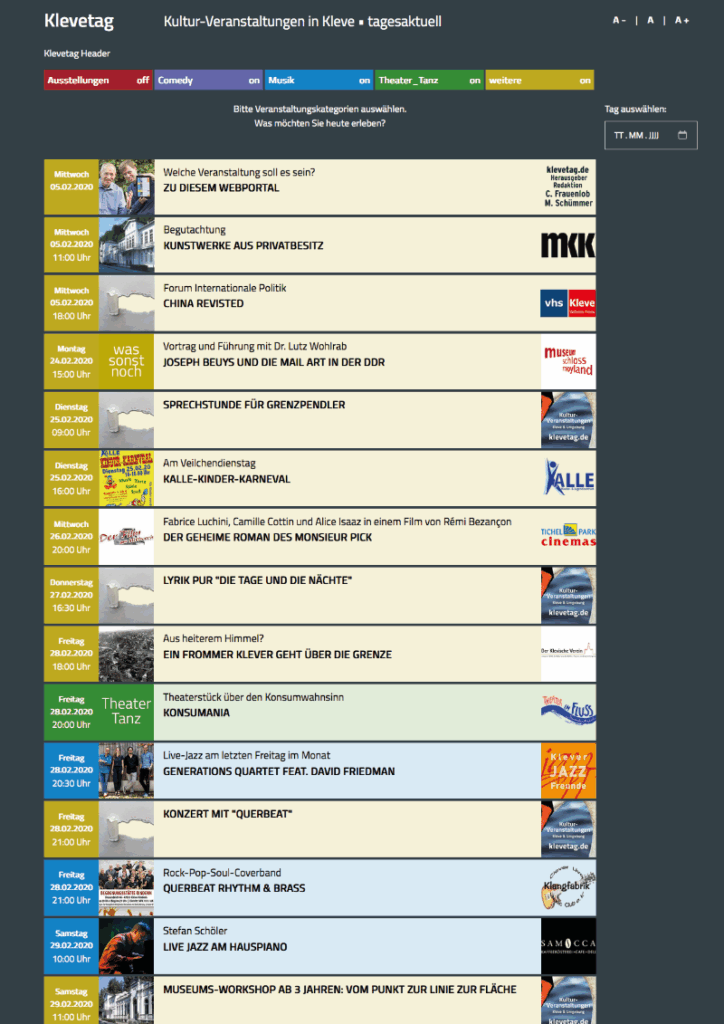 Im Jahr 2019 hatten wir einen Kalender programmiert und online gestellt, viele Veranstaltungstermine eingepflegt. Über die zentral gesteuerten Restriktionen ab 2020 war das kulturelle Leben nicht mehr möglich – Termine mussten reihenweise abgesagt werden. Unsere Aktivitäten sind darüber eingeschlafen. Für 2026 planen wir einen Relaunch der website www.klevetag.de. Denn immer wieder werden wir drauf angesprochen, dass so ein Portal für Kleve fehlt.